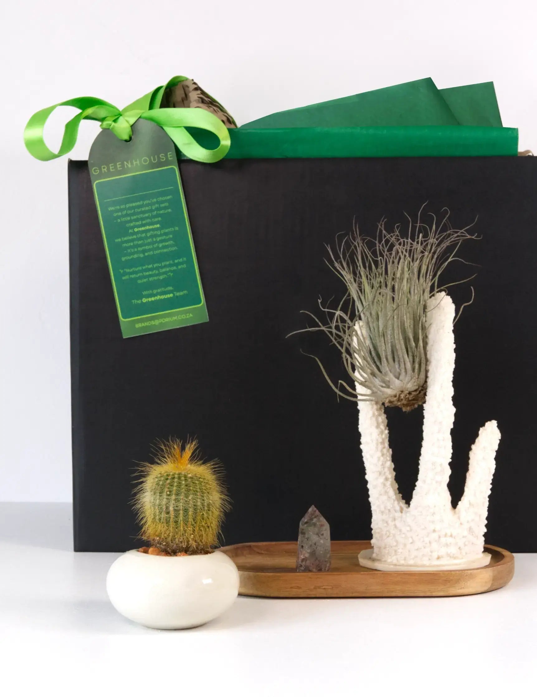 This sculptural set brings together earthy textures with soft tones and zen. Featuring a coral-inspired sculpture, easy-care cactus, air plant, and a grounding crystal. It’s designed to add a sense of stillness and style to any home or desk.