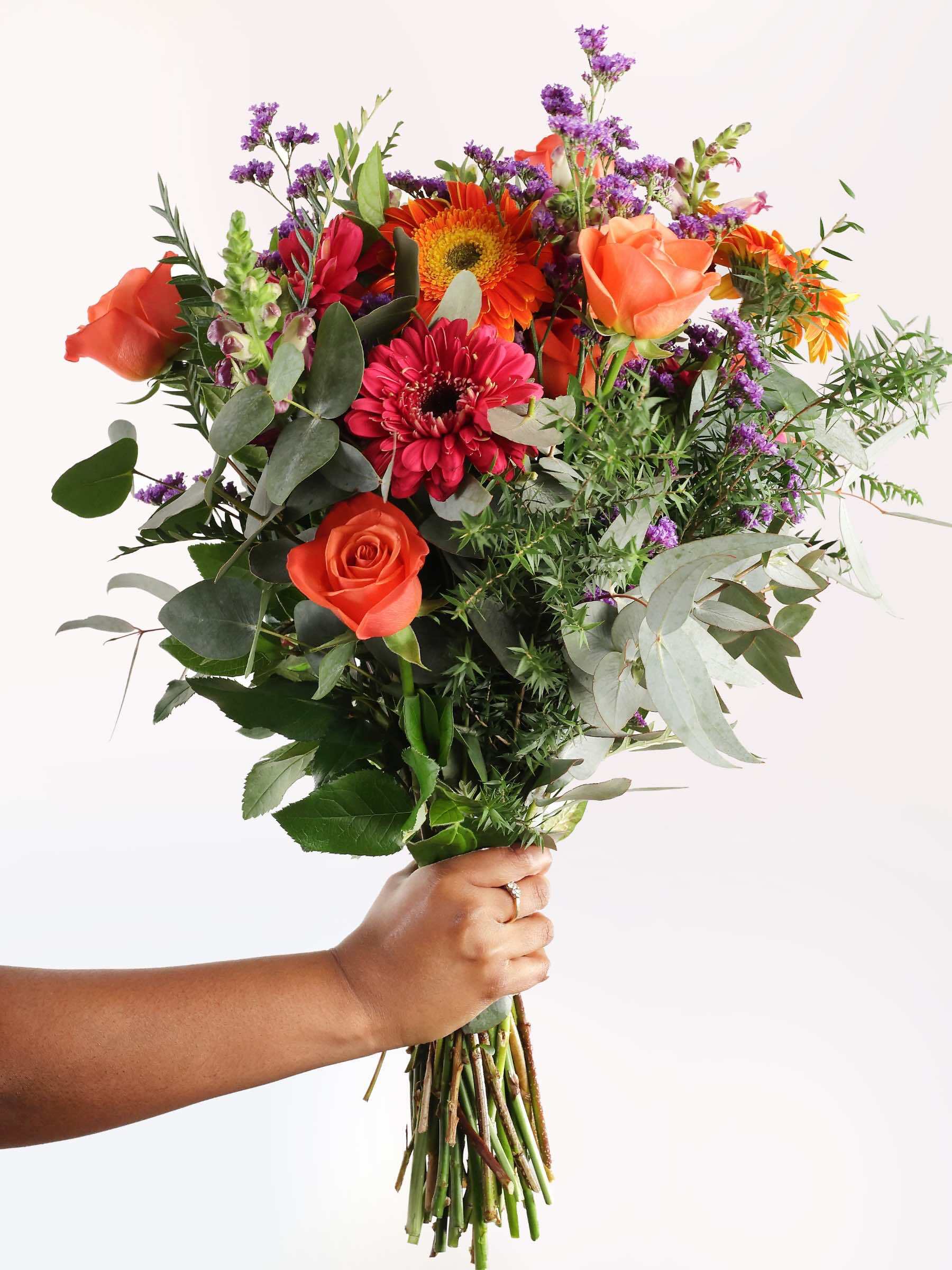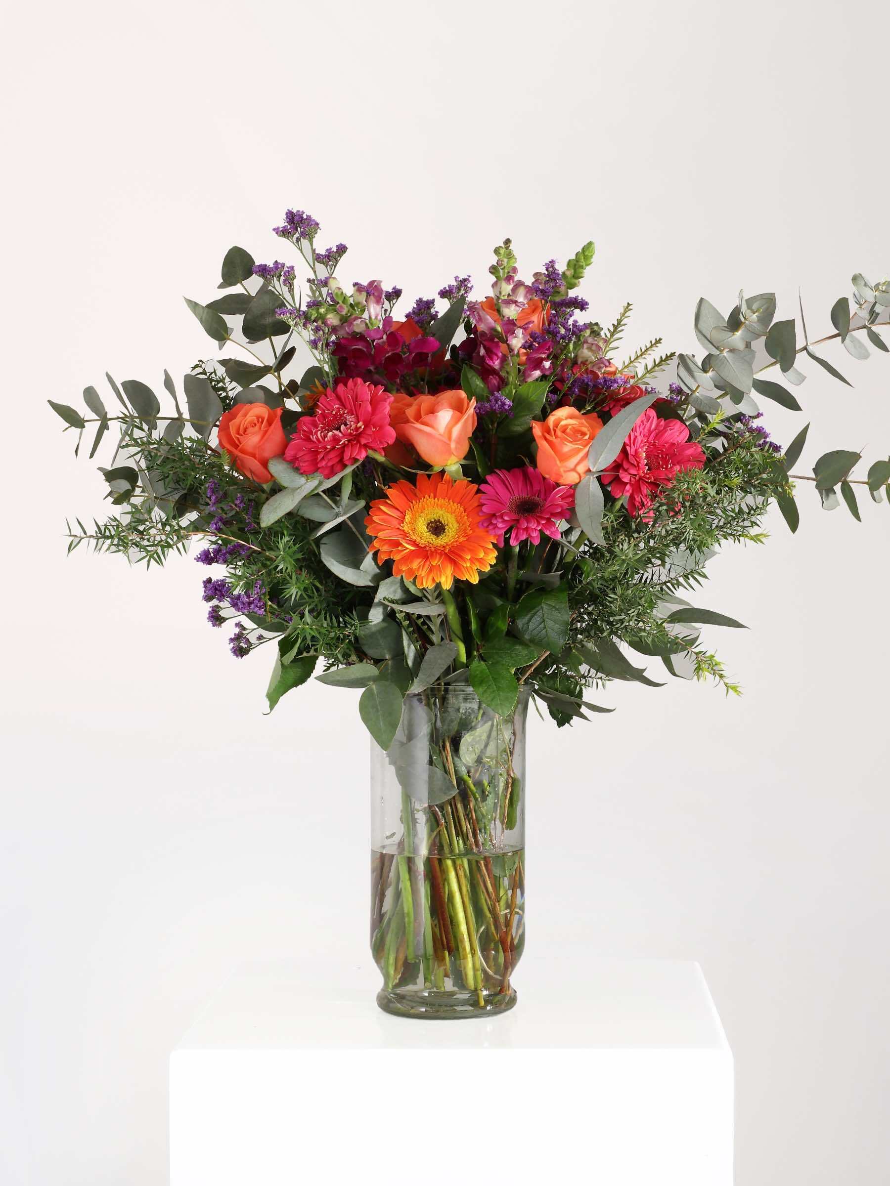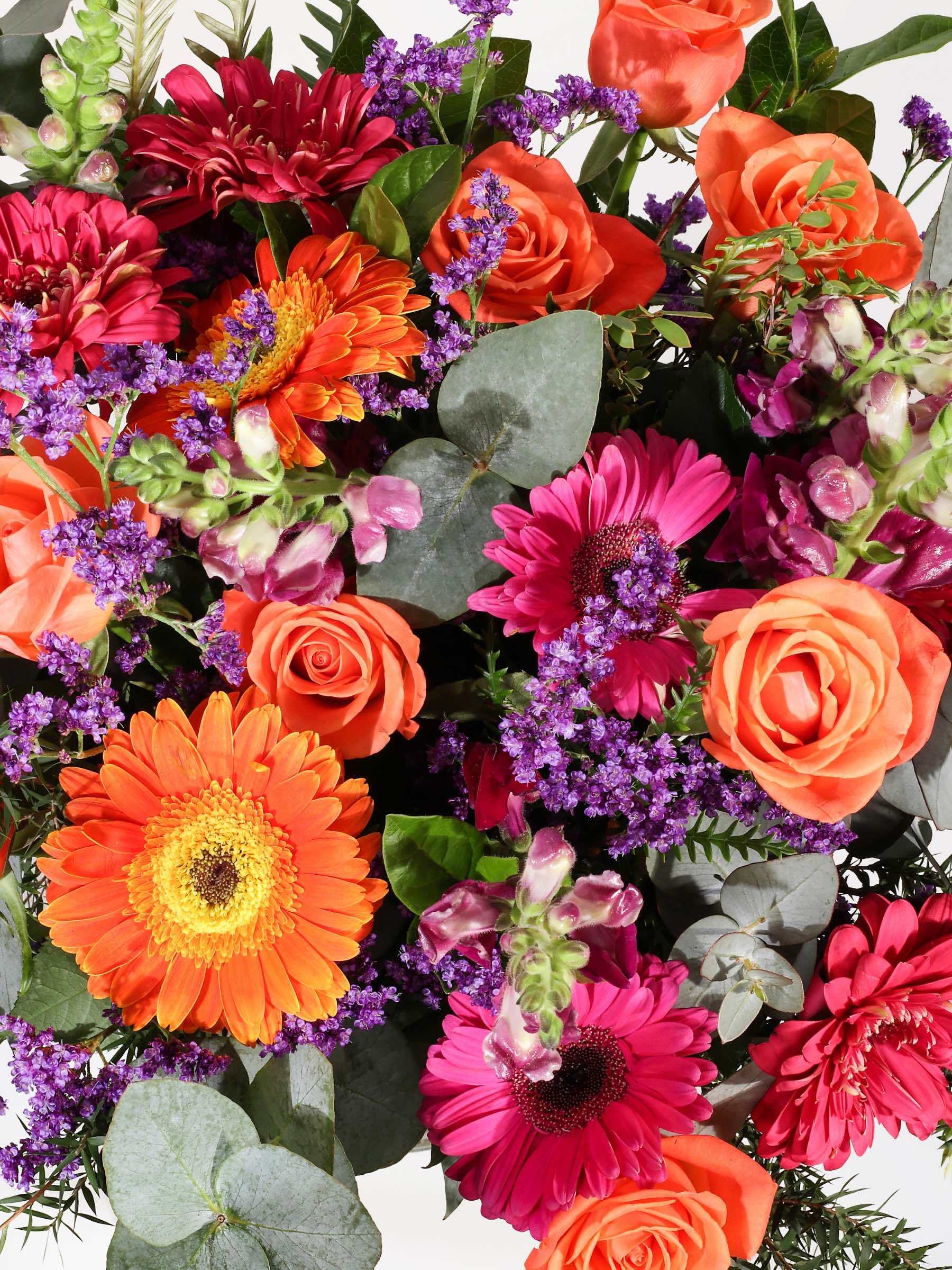 A gift means so much more when it’s straight from the heart. This stunning mixed flower bouquet of passionate pinks, purples and oranges are expertly arranged and perfect for any celebration. It’s a surprise that speaks volumes and sends happiness.