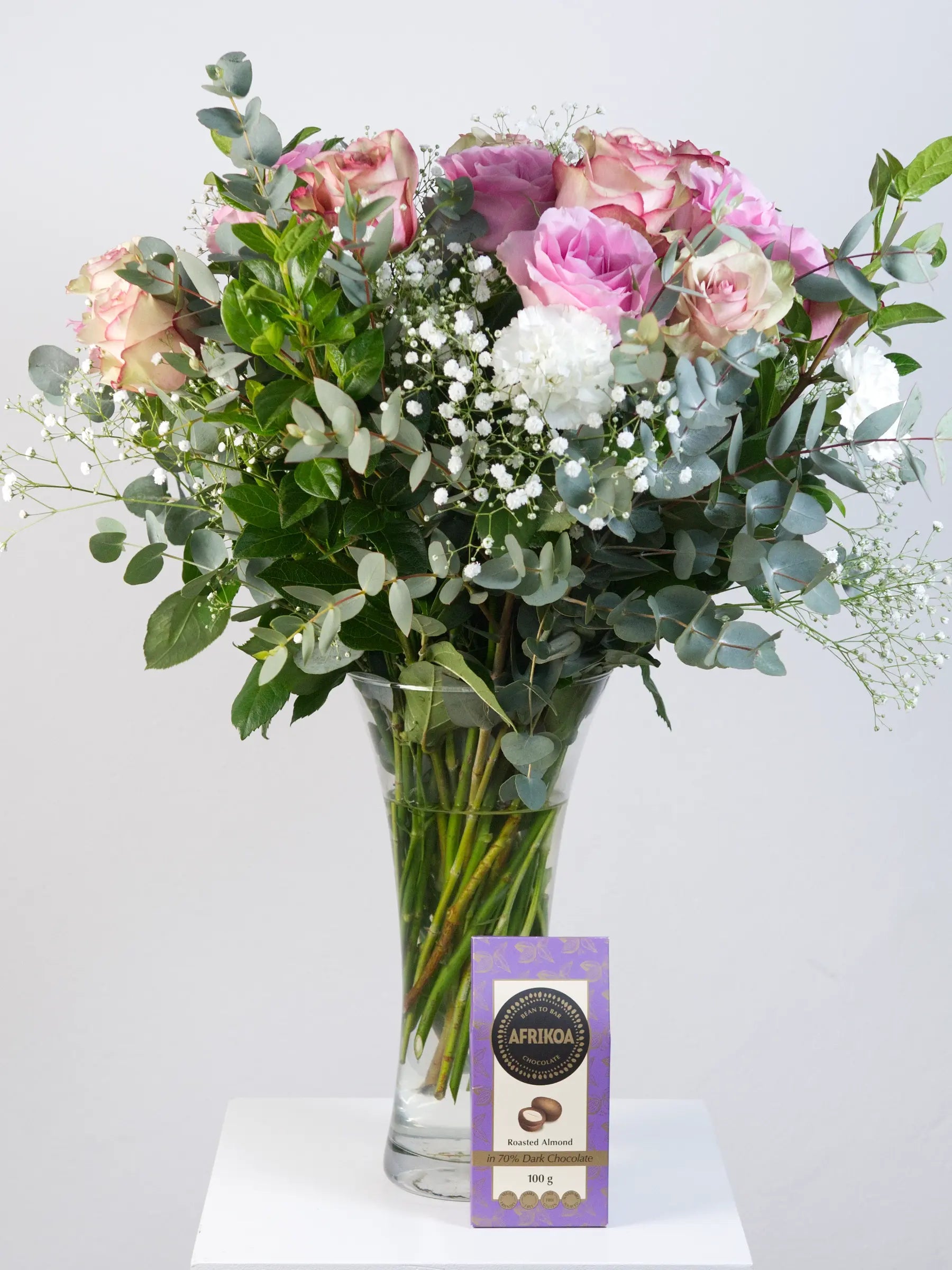 Arranged with care by local South African florist artisans, it features white carnations, soft peach and light pink roses, framed by gypsophila, fresh eucalyptus, and viburnum, all presented in a classic glass vase. As a finishing touch, a 100g box of Afrikoa Roasted Almond in 70% Dark Chocolate is included, adding an indulgent note that makes this gift feel truly complete.