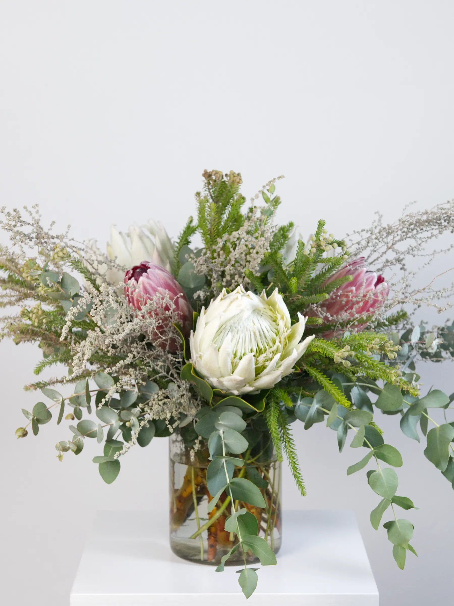 The king protea takes centre stage, joined by pink ice protea, wax flower, slangbos, and eucalyptus, all presented in a glass vase.