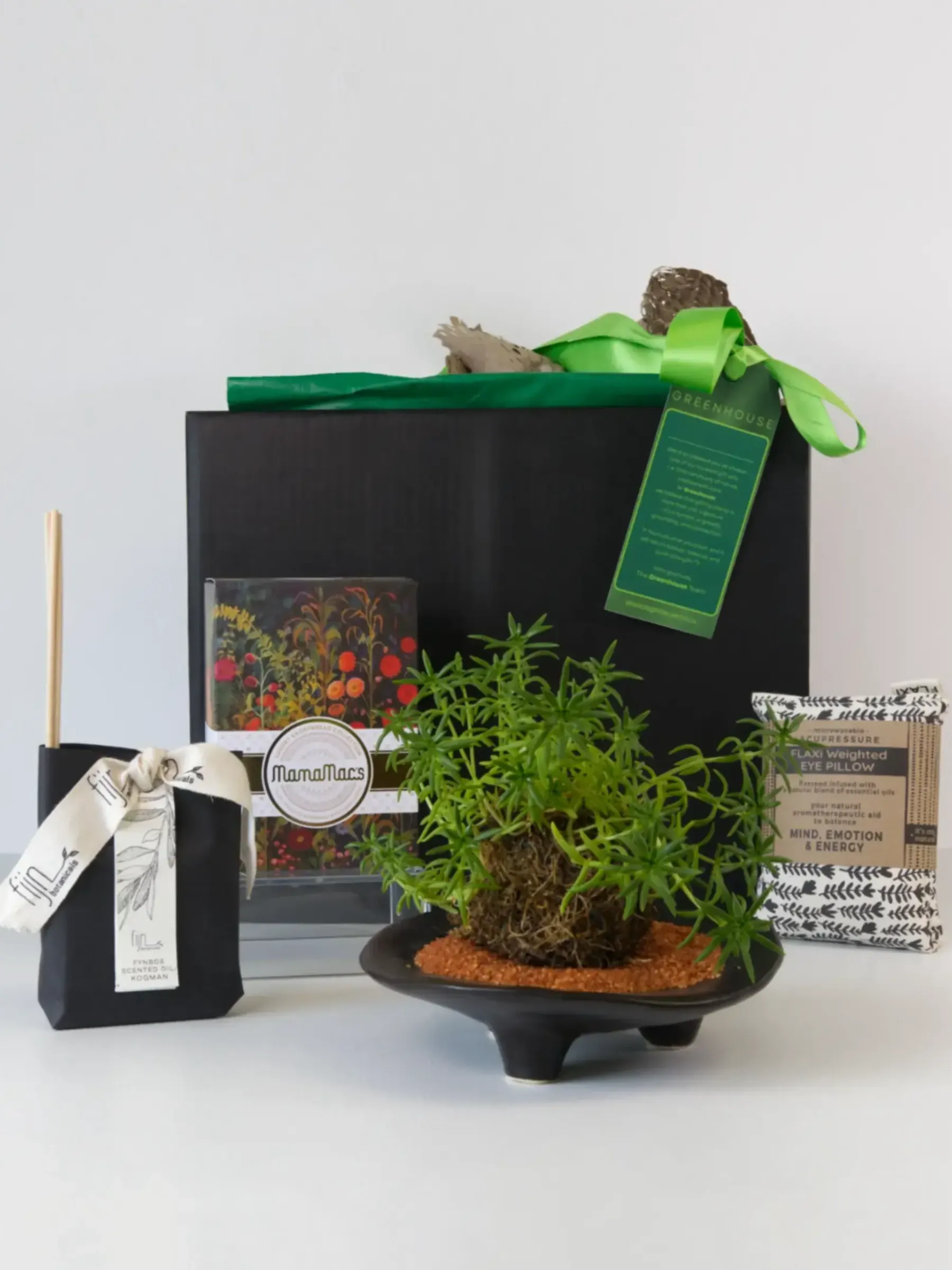 At the heart of this wellness-inspired gift is a kokedama — a traditional Japanese moss ball plant that brings earthy texture and sculptural beauty to modern interiors. Paired with botanical treats and sensory comforts, this set is ideal for birthdays, Christmas, graduation gifts, for him or anyone who loves indoor greenery and intentional living.