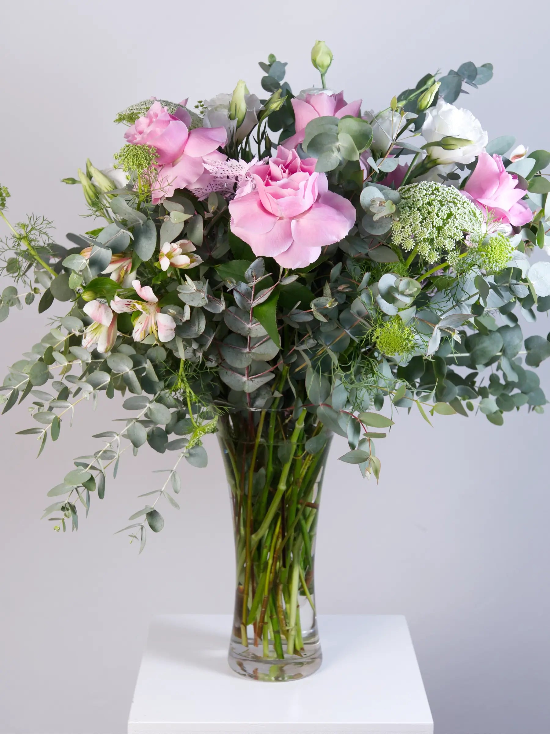 At its heart are light pink roses, each one expertly reflexed by hand to coax open their petals and create an effect that is breathtaking in its elegance. These are accompanied by white lisianthus, pink alstroemeria, lace, green and pink leather leaf, and fresh eucalyptus, all presented in a glass vase.