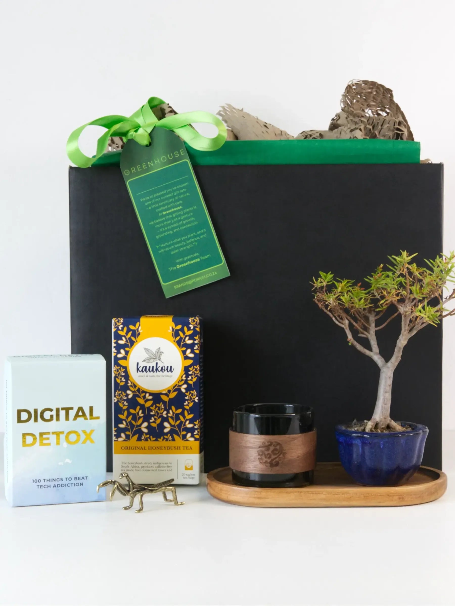Centred around a Money Tree Bonsai known for its symbolism of prosperity, strength, and balance. This botanical gift bundle includes natural honeybush tea, a glass tea cup with wooden guard, a detox card set for mindful reflection, and a delicate dragonfly trinket to remind you to stay light and present.