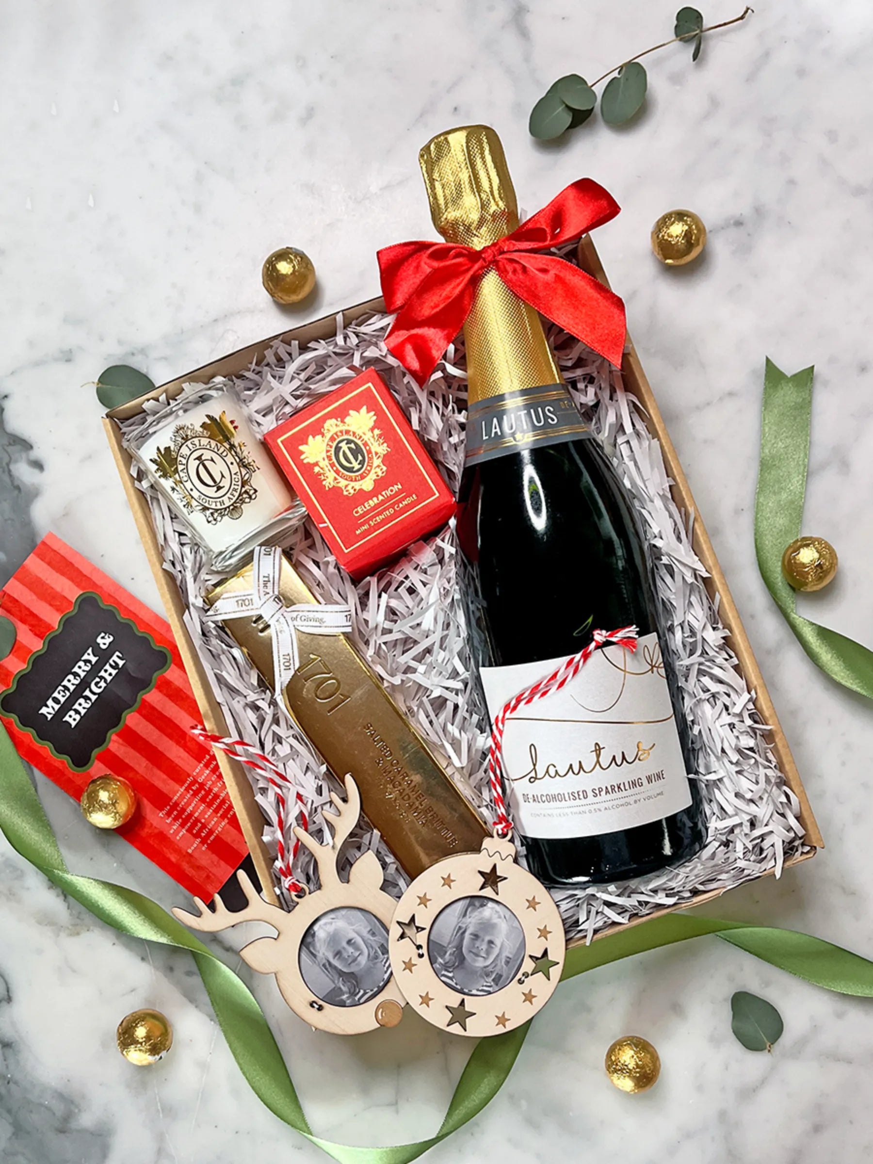 A little box of celebration and connection. Pop open a Lautus Non-Alcoholic Sparkling Wine and let the bubbles set the tone, while the Cape Island Celebratory Scented Candle fills the space with warmth and joy. Sweet indulgence comes from the 1701 Nougat Bar, and the two photo baubles hold cherished memories close.